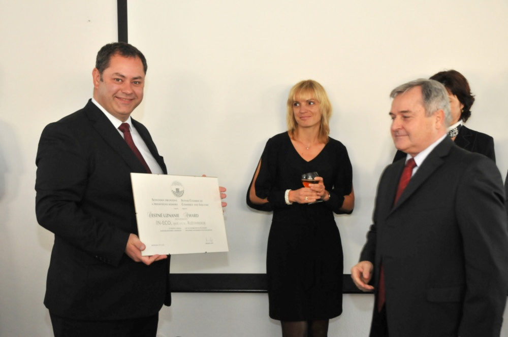 According to the proposal from Regional Chamber in Žilina (regional branch of the Slovak chamber of Commerce and Industry) Directory of the Slovak chamber of Commerce and Industry (SCHCI) approved the „Award“ for the company IN-ECO spol. s r.o. Ružomberok at its plenary session on 21st of June 2011 for the constribution to the economic development and business in the Slovak republic. The Award was taken over 18th of April 2012 by the chief executive of the company IN-ECO Mr. Igor Tomek from vice-president of SCHCI Ing. Juraj Kostolný and president of Regional chamber SCHCI in Žilina Ing. Ján Mišura.